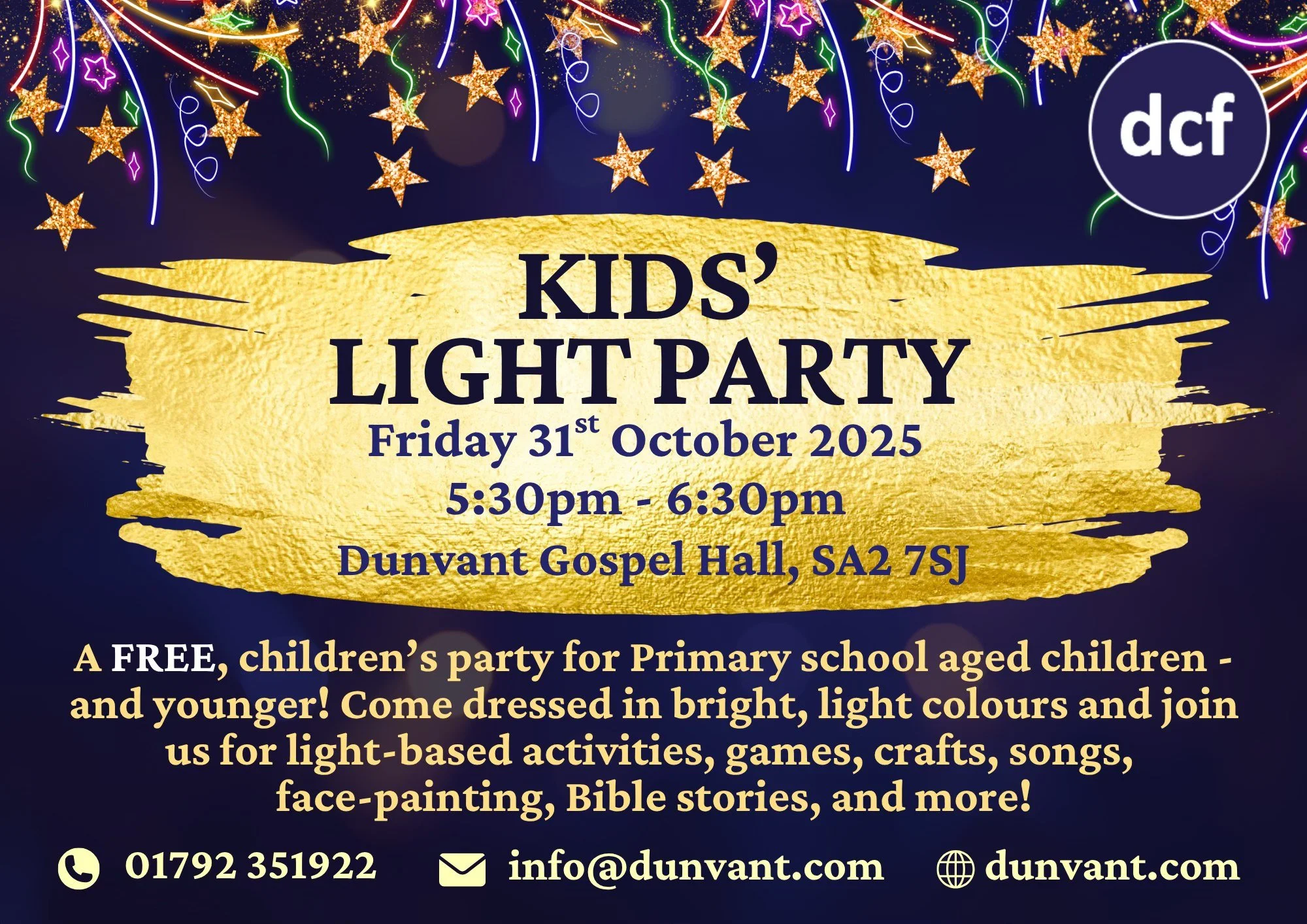 What: A FREE children's party for primary school aged children and younger! Come dressed in bright, light colours, and join us for light based activities, crafts, games, face-painting, songs, Bible stories, and more!